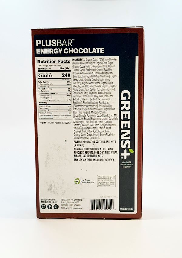 Ingredients: Organic Dates, Organic Almonds, Organic Dark Chocolate (Organic Cocoa Liquor, Organic Cane Sugar, Organic Cocoa Butter), Organic Tapioca Syrup, Pea Protein, Chicory Root Fiber, *Greens+ Superfoods® Advanced Multi Superfood Proprietary Blend, Organic Quinoa, Organic Brown Rice Crisps (Organic Brown Rice, Organic Brown Rice Syrup, Salt), Organic Purified Stevia Extract, Mixed Tocopherols (Natural Vitamin E). *Greens+ Superfoods® Advanced Multi Superfood Proprietary Blend [Lecithin (From GMO-Free Sunflower), Organic Apple Fiber, Algae Calcium (Lithothamnion spp.), Organic Barley Grass, Organic Wheat Grass, Organic Spirulina (Arthrospira platensis), Organic Alfalfa Grass, Organic Chlorella (Chlorella vulgaris), Camu Camu Berry (Myrciaria dubia), Organic B-Complex (from Guava, Holy Basil, and Lemon Extracts), Vitamin E (as D-Alpha Tocopheryl Succinate), Astragalus Root Extract (Astragalus membranaceus), Licorice Root Extract (Glycyrrhiza glabra), Milk Thistle Seed Extract (Silybum marianum), Siberian Eleuthero Root Extract (Eleutherococcus senticosus), Organic Beet Root (Beta vulgaris), Organic Dunaleiella Salina Algae, Organic Dulse (Palmaria palmata), Grape Seed Extract (Vitus vinifera), Green Tea Leaf Extract (Camellia sinensis), Vitamin A (as Beta-Carotene), Bilberry Fruit Extract (Vaccinium myrtillus), Vitamin D3 (as Cholecalciferol), Fulvic Acid]. Made with Certified Organic Ingredients.