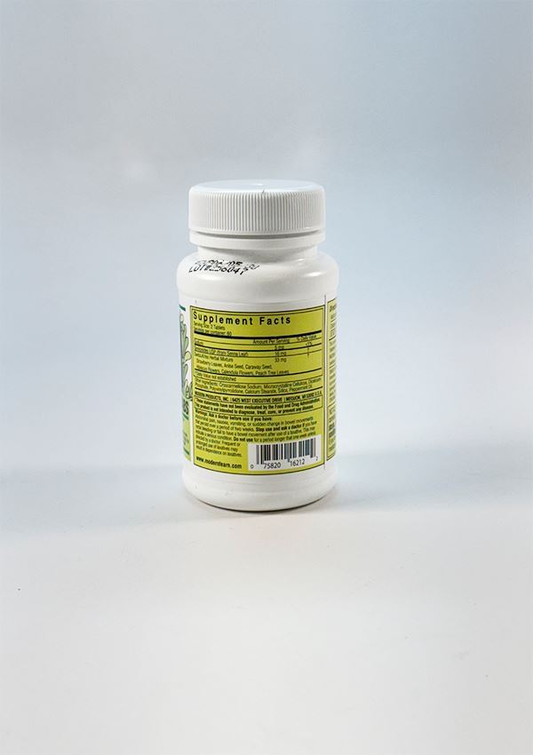 Inactive Ingredients: Swiss Kriss herbal mixture (anise seed, calendula flower, caraway seed, hibiscus, peach leaves, peppermint oil, strawberry leaves), binding agents (calcium stearate, croscarmellose sodium, dicalcium phosphate, microcrystalline cellulose, polyvinylpyrrolidone, and silica).