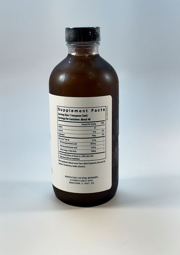 Ultra Pure Fish Oil 2600 in liquid form provides an extremely high concentration of EPA and DHA for people who find it difficult to take several softgels per day or swallow large pills. Ultra Pure Fish Oil 2600 provides protection and maintenance of normal function, fluidity and health of cell membranes. Fish oil contains the essential fats EPA and DHA. These fats help maintain and support soft tissue and connective tissue. Fish oil helps promote cartilage and joint function and relieves mild mood changes and cramps associated with the menstrual cycle. Fish oil helps maintain platelet aggregation levels that are already in the normal range. Large doses of fish oil maintain healthy neural and cardiovascular function. Ultra Pure Fish Oil has a pleasant natural lemon flavor.