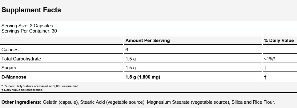 D-Mannose is a simple sugar that occurs naturally in some plants, including cranberries. Although small amounts of D-Mannose are metabolized by the human body, much of it is rapidly excreted in the urine. In the bladder, D-Mannose can adhere to undesirable foreign particles, preventing them from sticking to the lining of the bladder. These particles can then be flushed away during urination. Because insubstantial amounts of D-Mannose are used by the body, it does not interfere with blood sugar regulation.