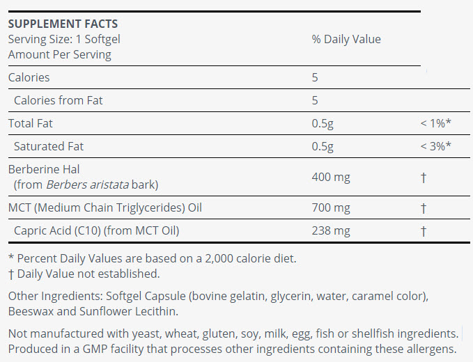 Berberine is a natural constituent of herbs such as goldenseal, Oregon grape, and barberry. Clinical studies have demonstrated that Berberine helps to support already normal glu-cose and lipid metabolism. Berberine is, however, known for its limited bioavailability; therefore, this product includes Caprate (C10, a Medium Chain Triglyceride) to promote optimal absorption and maintenance of gastrointestinal comfort during Berberine sup-plementation.